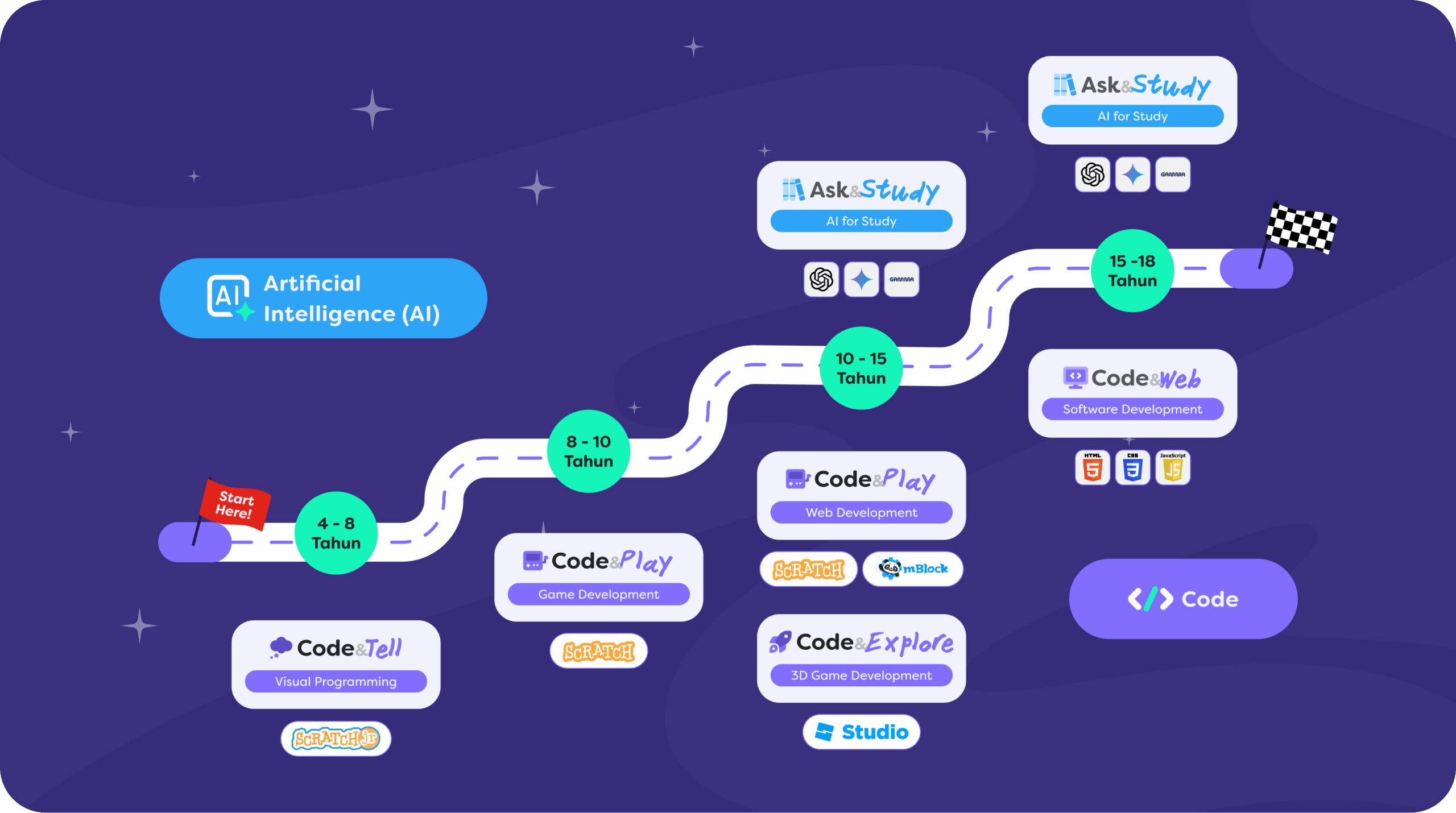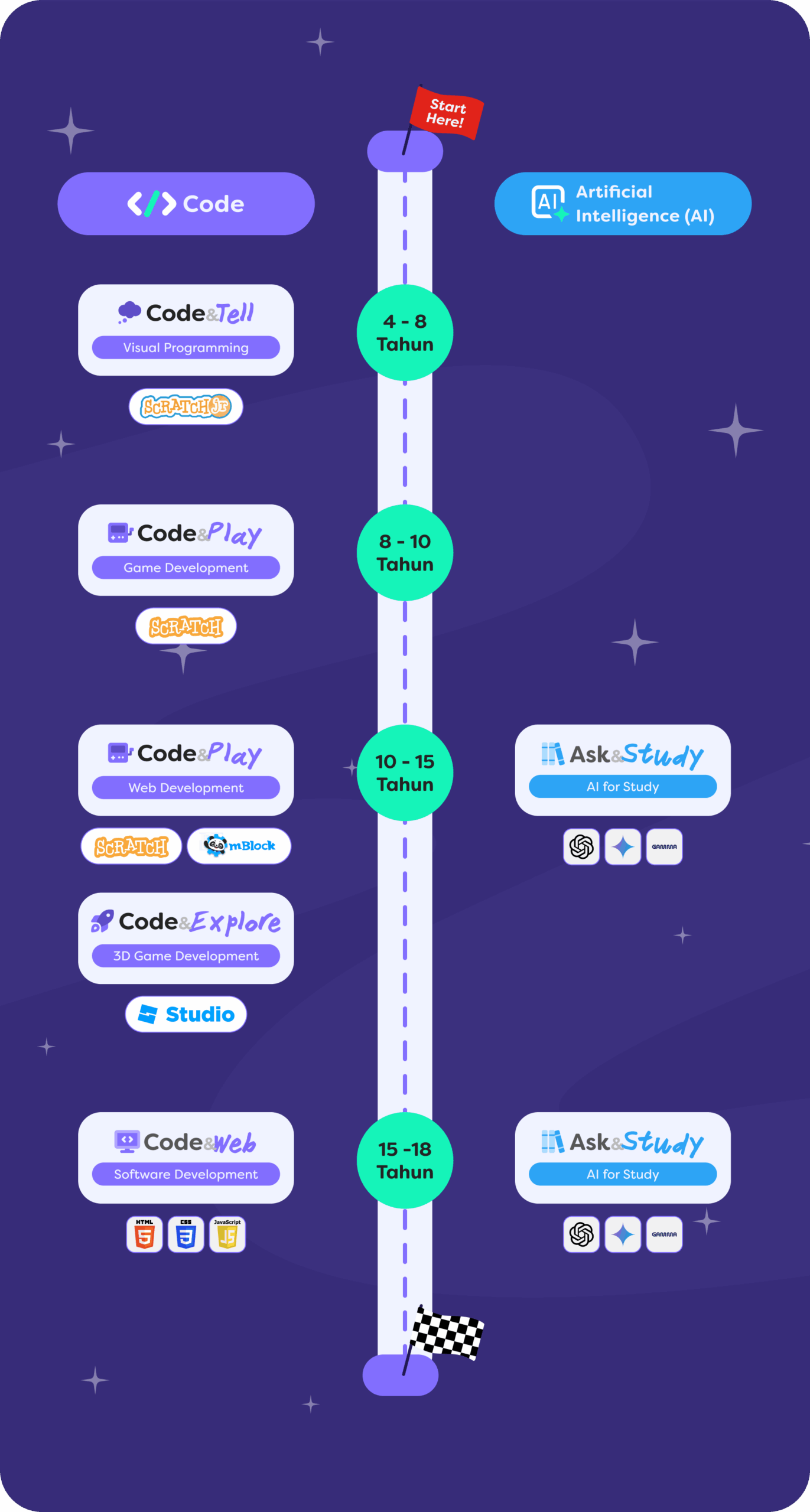Melalui pendekatan interaktif dan menyenangkan, anak belajar membuat game, animasi, website, hingga memanfaatkan AI. Tujuannya bukan hanya jadi pengguna teknologi, tapi juga tumbuh sebagai pencipta digital yang kreatif dan siap menghadapi masa depan.